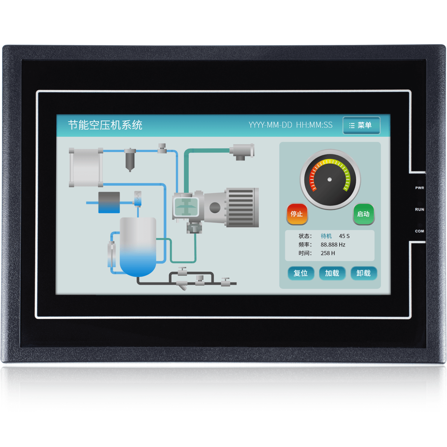 金璽HMI在變頻器的應用,采用MODBUS協議與變頻器通訊,對變頻器進行啟停控制,對變頻器的電流,頻率,功率等進行監控。